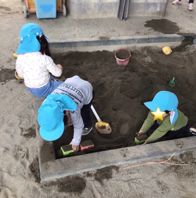 片付けをしていた際、築山がひっくり返ってしまいました。するとユラユラと揺れる事を発見!上に乗って落ちそうなスリルを楽しみ、友達とシーソーのように上がったり下がったりと遊んでいました。