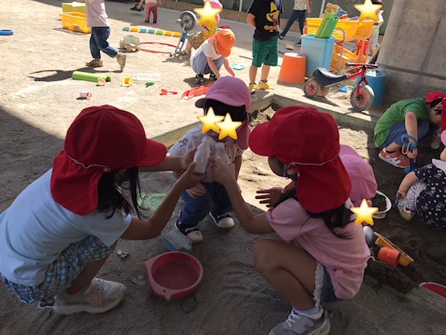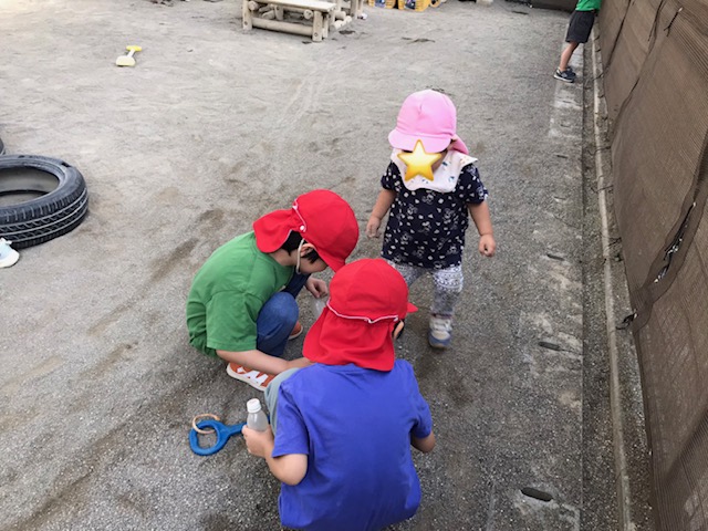 先週一緒にお散歩へ行ったうさぎ組さんにも見せてあげたり、一緒に探すなど関わりが見られました。