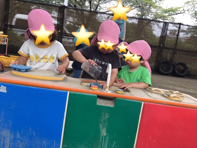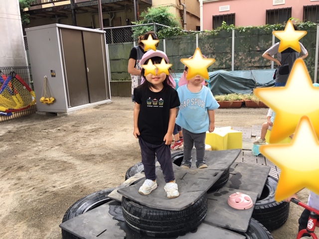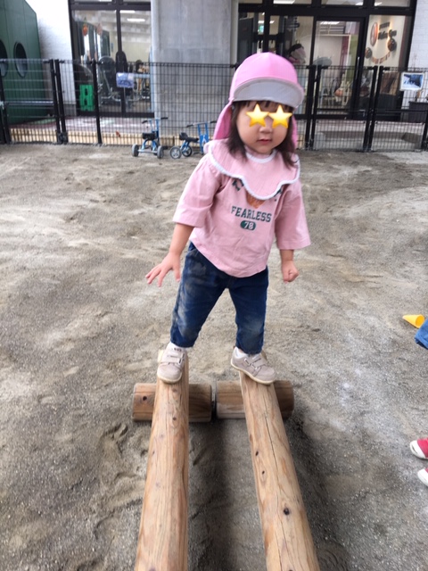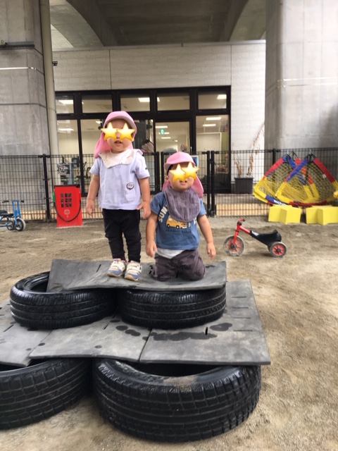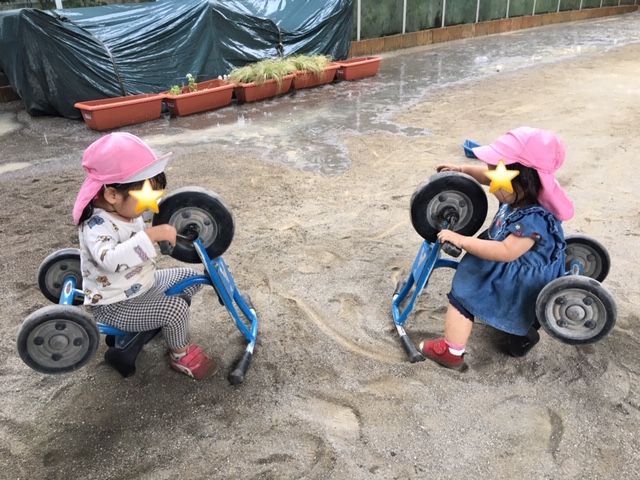 三輪車を逆さにしてペダルを手で回すのが楽しいうさぎ組さんです。