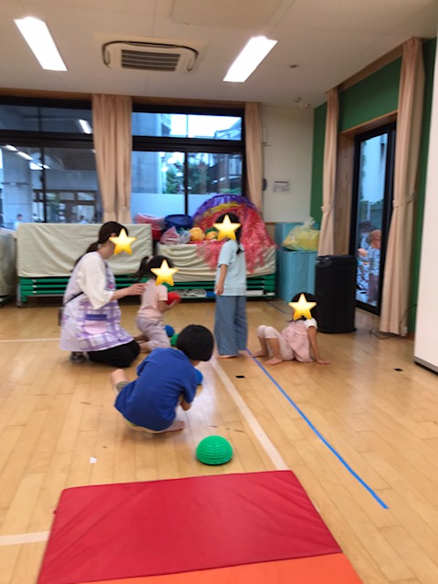 今日はバルーンの取組の後、ホールで遊びたいと子どもたちからのリクエストがあり、 ホールで遊びました。