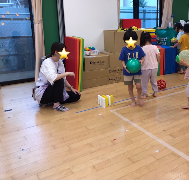 最後はボーリング大会をしました。 ブロックの棒をピンに見立て、何本倒せるかチャレンジしていました。