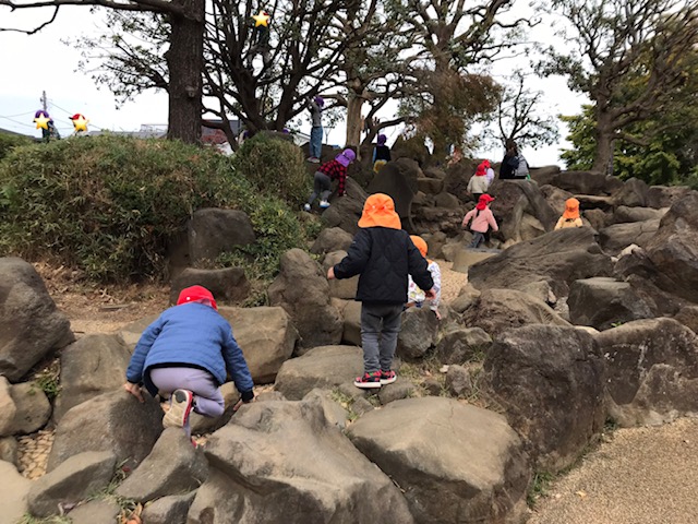 岩場ではそら組やにじ組が木に登る姿や、岩の上に登る姿をみてほし組の子どもたちも一緒になって挑戦する姿がありました。登り方や危ないところなどを子どもたち同士で教え合う姿がありました。