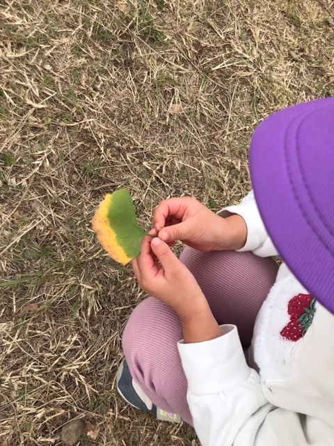 また、いちょうの葉が2色になっていることを発見し、「どんどんきいろになるんだよね」と色の変化を観察しました。秋の自然も触れることができ、楽しいお散歩になりました。