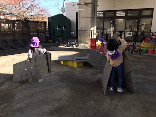 また、かくれんぼを楽しむ姿もありました。 マットや園庭の玩具を使って隠れる姿がありました。 「〇〇ちゃんみーつけた!」「みつかっちゃったー」とやり取りを楽しむ姿が見られました。