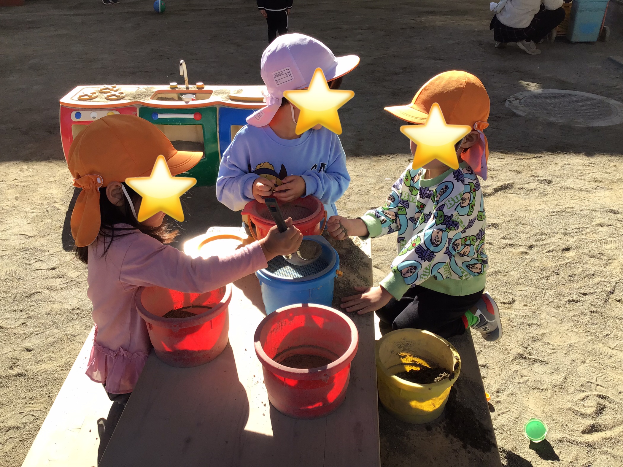 テーブルのところでは何かを作っていました。「お楽しみー」「きっと好きなものだよ」と言いながら、混ぜていました。 ざるを振って、残った小さな砂利に気づいて、「これは魔法の砂だよ」と言っていまいした。
