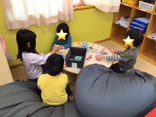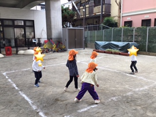 中当てでは、中で逃げる子もきゃー!と言いながらもニコニコ顔で逃げていて、外から投げる子も楽しんでいました。