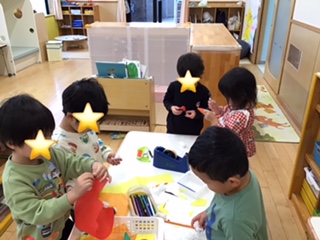 お部屋では自由に制作遊びなどをして、お寿司作りを始めると、「あっ!たまごだ!」と言って、「えびがいい!」「いくらがいい!」「サーモンは?」とどんどん作っていました。