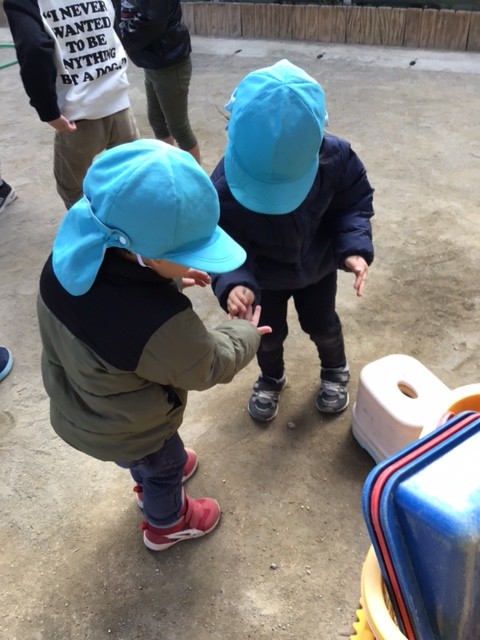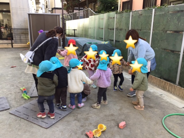 最後は”むっくりくまさん”という遊びをしました。 お友達と手を繋いで歩いたり、くまさんになって寝る真似をしたり、走って逃げたりと、とっても楽しそうでした。