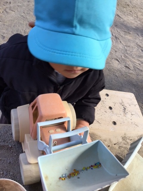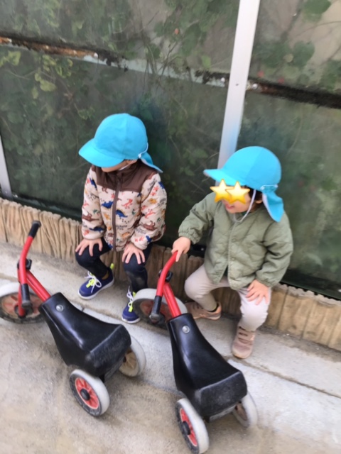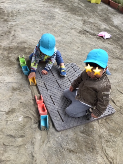 園庭で遊びました。 バスマットの駅の周りを、電車が走っていました。