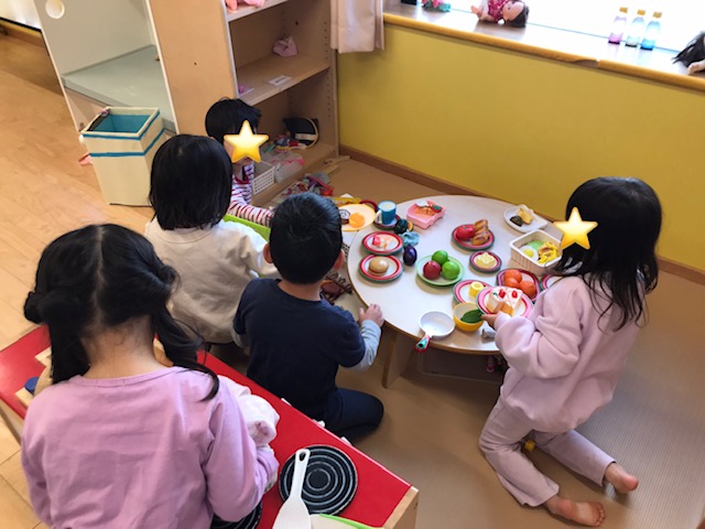 「おにくやけたよ!」「こげないようにね」とお友達とのやり取りを楽しみながら遊んでいました。