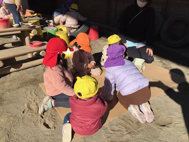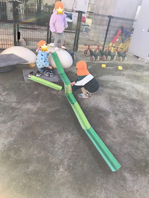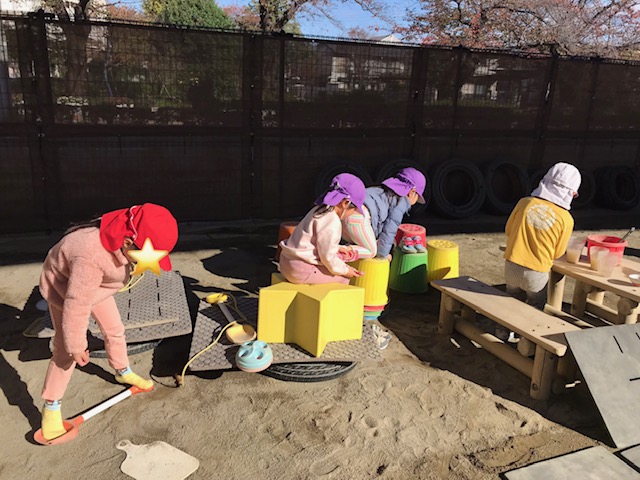 朝一番に園庭へ出て遊びました。 日向はポカポカと暖かく気持ちよさそうでした。 おうちごっこでは、猫がいるお家のようで猫やパパママになりきって楽しそうでした。