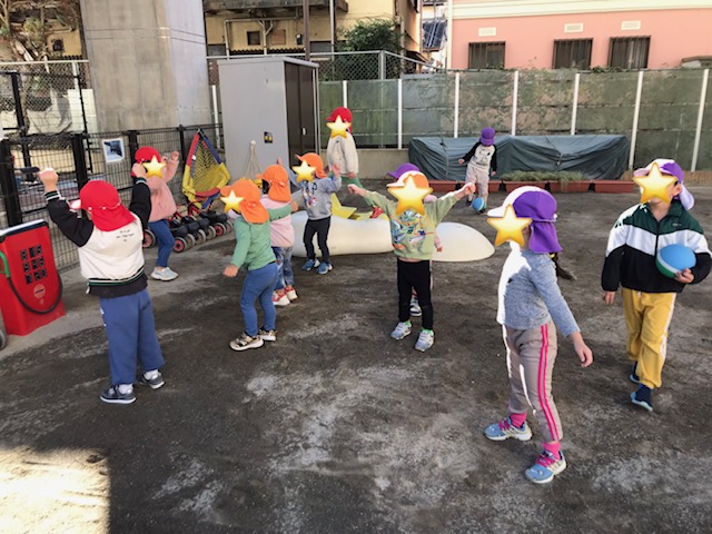 体を動かしたら暖かくなり、「ふれあいでーのきょくやりたい!」とリクエストがあり、そら組のフラッグの曲や、にじ組のバルーン、ほし組の体操をみんなで踊りました。