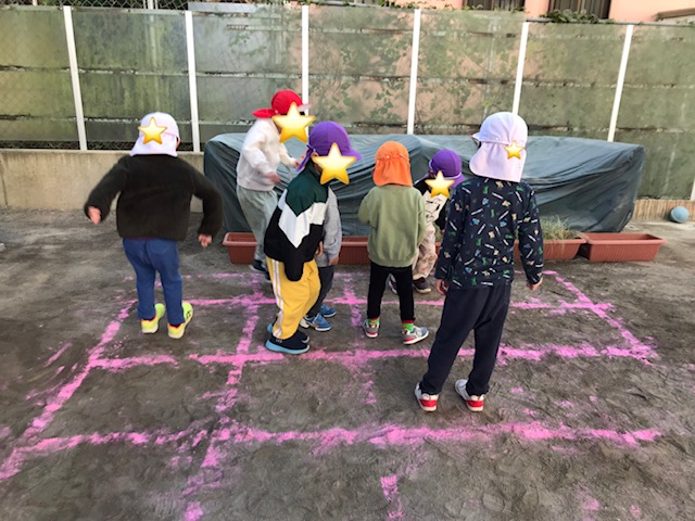 マス目鬼ごっこで遊びました。「せーの」の合図でジャンプをしたり、鬼から逃げる方法を考えながら遊ぶ姿がありました。