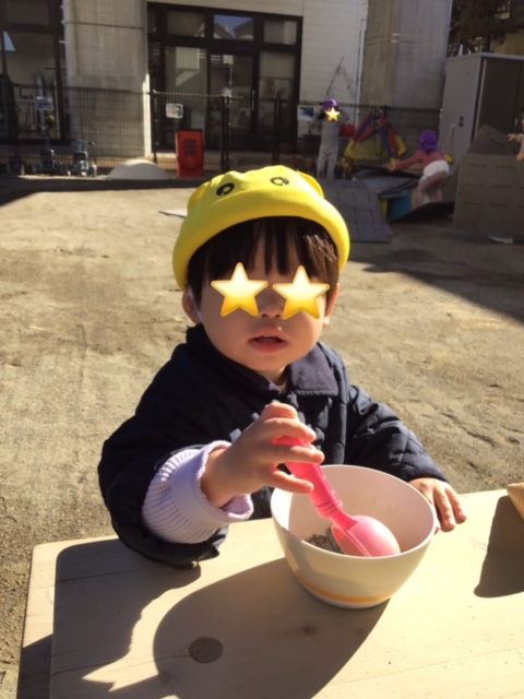 スコップで砂を混ぜてお料理を作っているみたいですね。