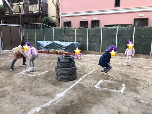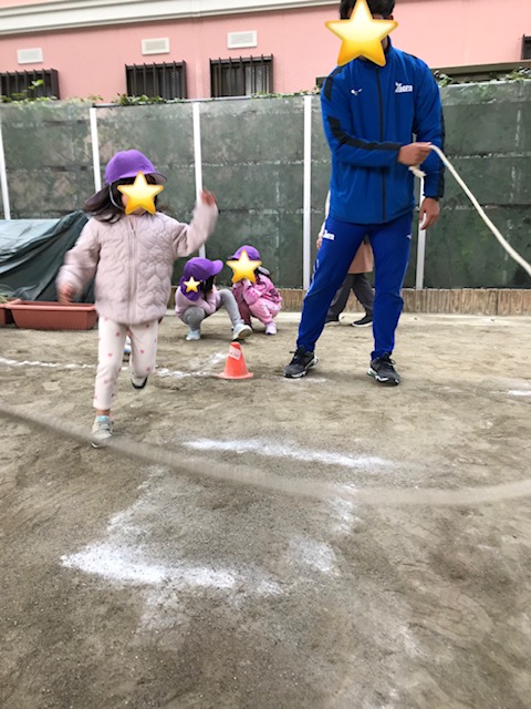 四角の中でジャンプを続けるとたくさん跳べるコツを教えてもらい、その場で跳ぶことを意識しながら縄跳びに取り組む姿がありました。