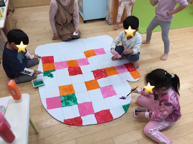 体育指導の後にはお楽しみ会の制作をしました。先週、子どもたちでてぶくろの色や模様を話し合って決め、今日は色塗りをしました。