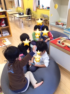 お部屋では戦いごっこの真似をしたり、おままごとでパーティーをしていました。 クッションの上でまったりとおしゃべりを楽しんでいます。