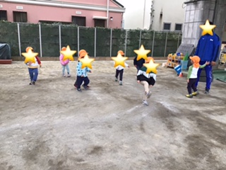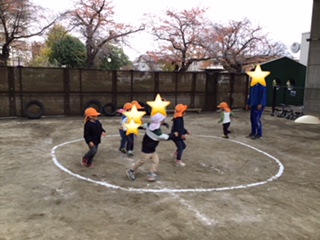 体育指導ではジャンプやスキップをしていると「走りたーい」と子どもたちから。思い切り走っていました。