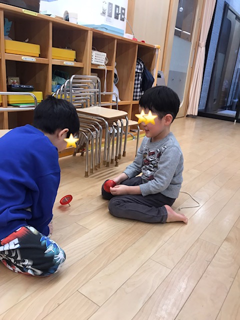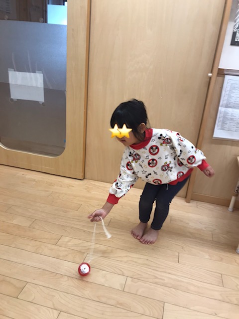 昨日の新年を祝う会で紹介があったお正月遊びをお部屋で楽しみました。こま、お手玉、けん玉、だるま落としです。どれも簡単にはできず、何度も何度も挑戦していました。諦めずに取り組み続ける姿がありました。段々とコツを掴み、「惜しい!」と友達といいながら楽しみました。