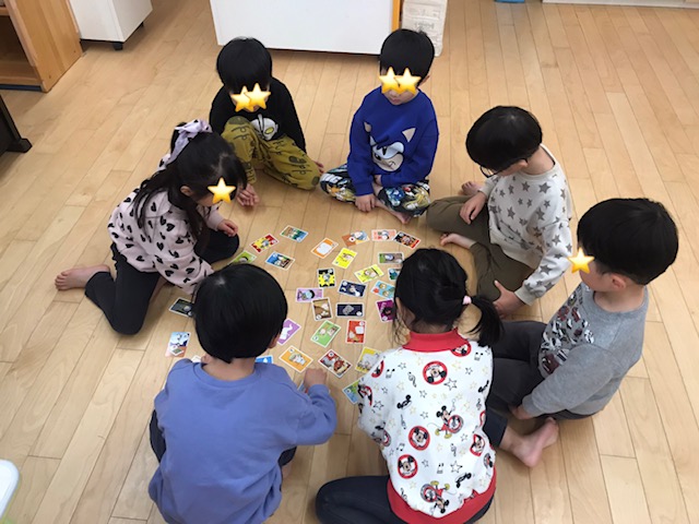 みんなでかるたもしました。よーく聞いてひらがなを見つけていました。