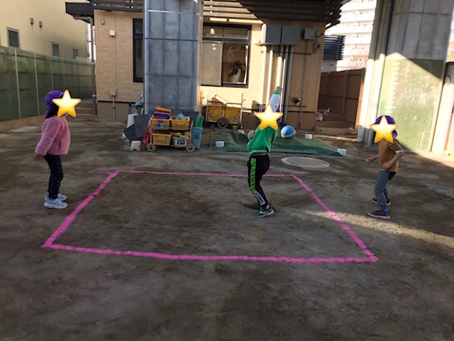 今日は中あてをしました。 中にいるお友達をサンドイッチすることや、ボールを取ったらすぐ投げることを意識してみました。 お友達と動きを合わせようとする姿がみられ、 中あてもどんどん楽しくなっている様子でした。