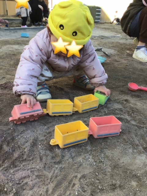 保育者と一緒に電車をつなげてみました。崩さずに運ぼうとしています。