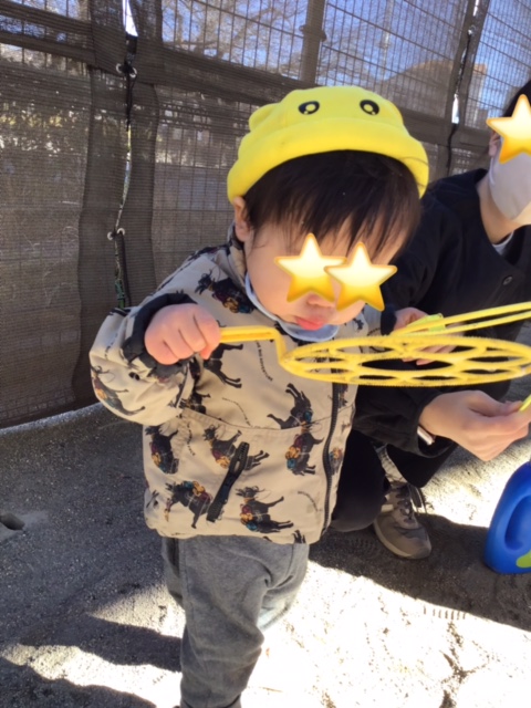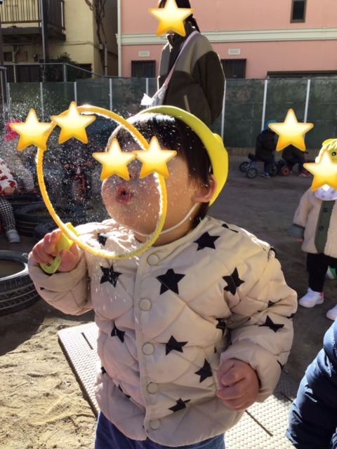 シャボン玉を自分で吹いてみました。上手に吹けたね。