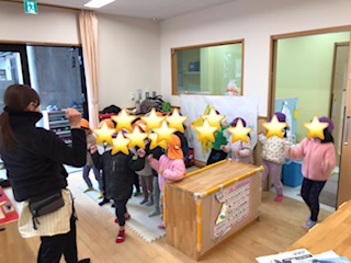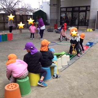 風が冷たいので、園庭に出る前に「鬼のパンツ」をみんなで踊って、体を温めてから行きました。