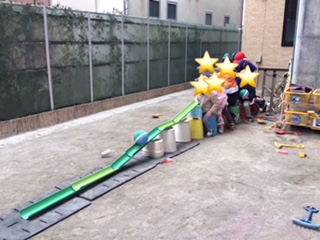 園庭では、バケツとスライダーで作ったところにボールを転がして遊んでいました。