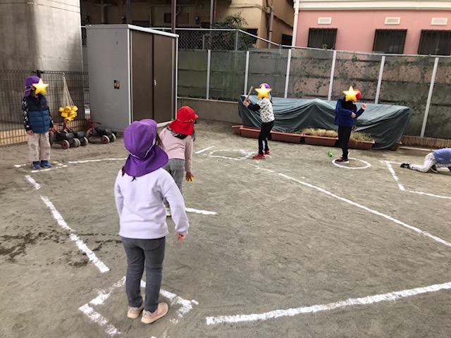 園庭遊びでは野球がブームで 「やきゅうやろう!バットかしてあげる!」と言ってお友達を誘い、そら組さんも一緒にみんなで遊びました。打ったら塁に進むなどルールが少しずつ分かり、より楽しさが増しています。