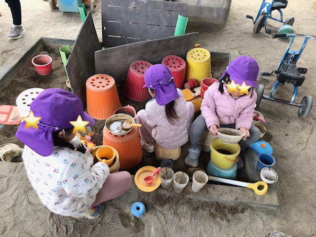 砂遊びではチョコレート屋さんやキャンプごっこをしていました。 「キャンプにいくから、もちものかくにんしてね」 「わすれものはない?」と持ち物確認をしたり、料理を作って持っていくなどお友達と役割を分けて遊んでいました。