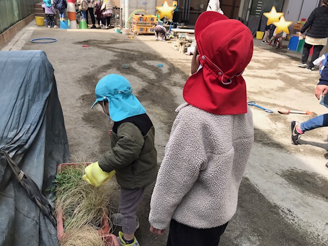 ぱんだ組さんと一緒に水やりをしました。「こっちも水あげてね」と今までそら組さんが行っていたことを教えていました。「僕たちが卒園しても水やりをしてくれるね」と安心していました。