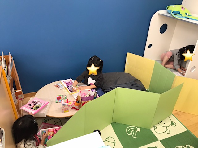 自分達で作ったランドセルやノートを使って遊んでいました。仕切りを使ってスペースを作るなどアイディアを出し合い遊んでいます。