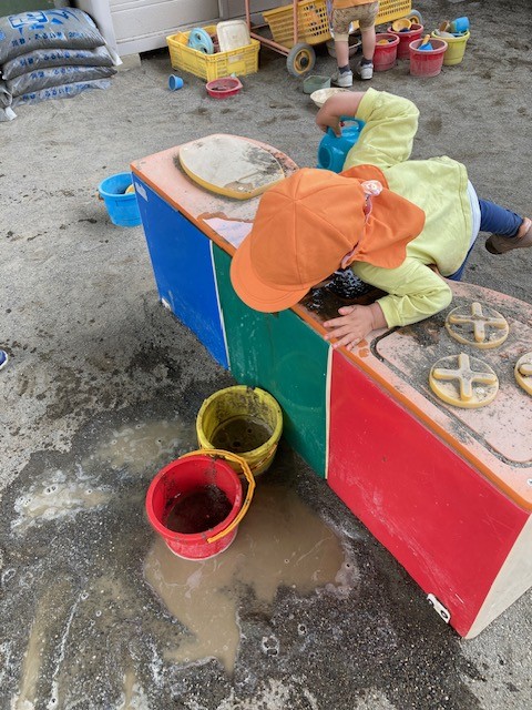 流れていく様子が楽しかったようで代わる代わるお友達同士協力して沢山水を流していました。