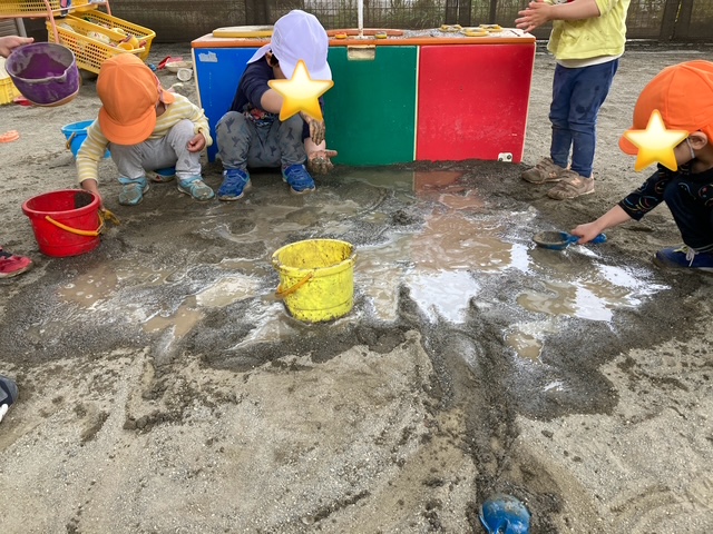 泥んこを触ることが楽しい様子で「ここは工事現場です!」と言って遊びが広がっていました。