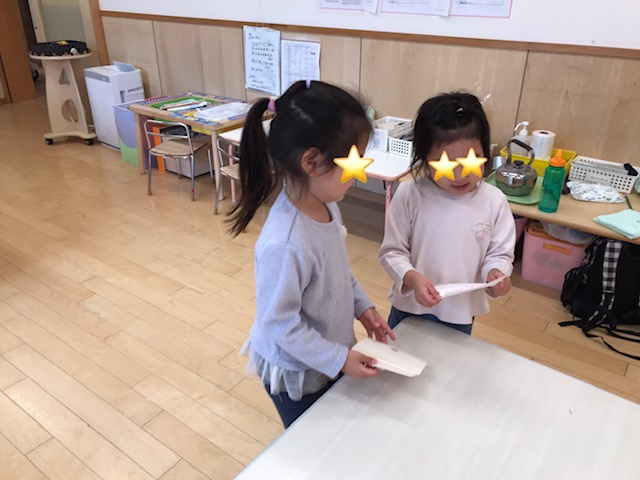 お友達が登園する前にお手紙を書いて、登園した後に音読をして伝えながら渡していました。