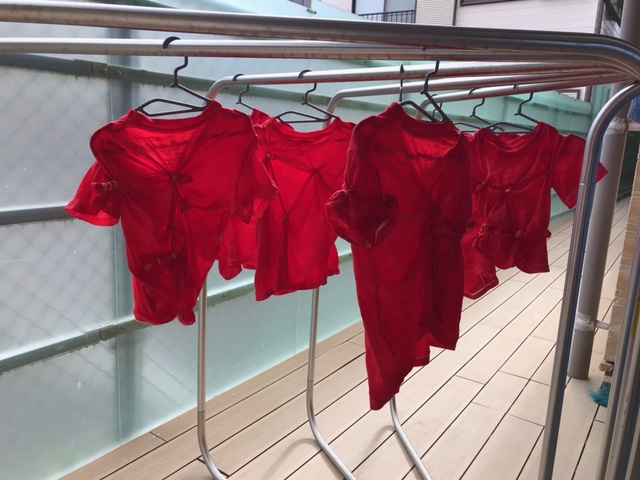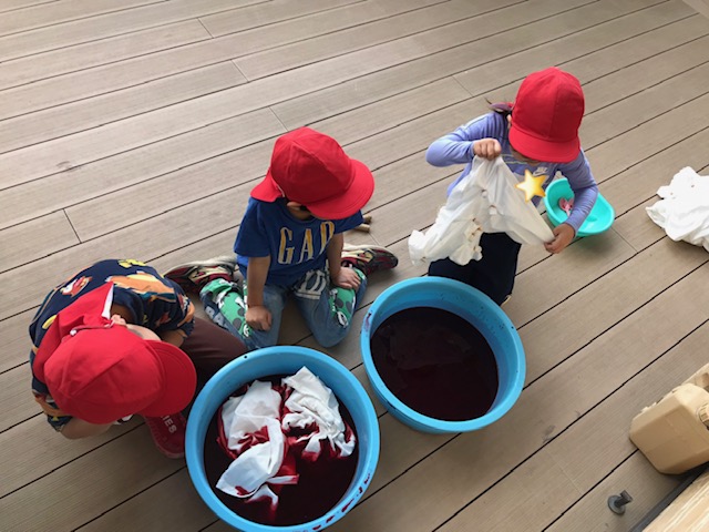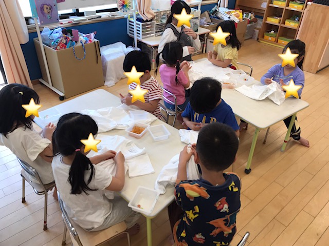 みんなでTシャツを染めました。 遠足の話やふれあいデーの話をすると、 「たのしみ!」「はやくきたいな」とこれからを楽しみにしながら作りました。