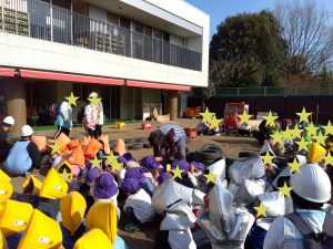 関東地方で地震が発生し、その後近隣から火災が発生という想定で園庭に避難しました。