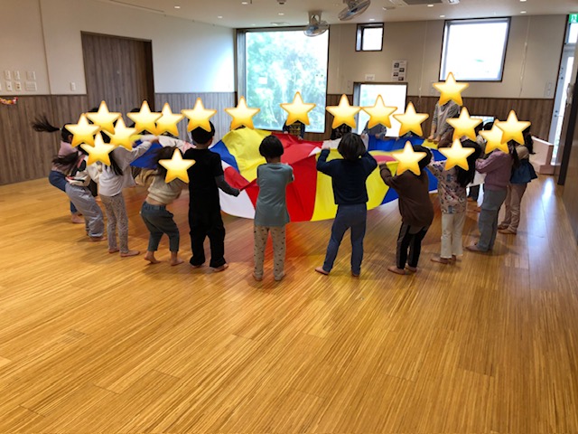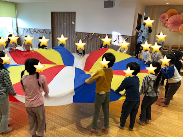 さくら組とそら組とでパラバルーン「それもいいね」の曲に合わせて遊びました。