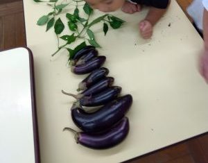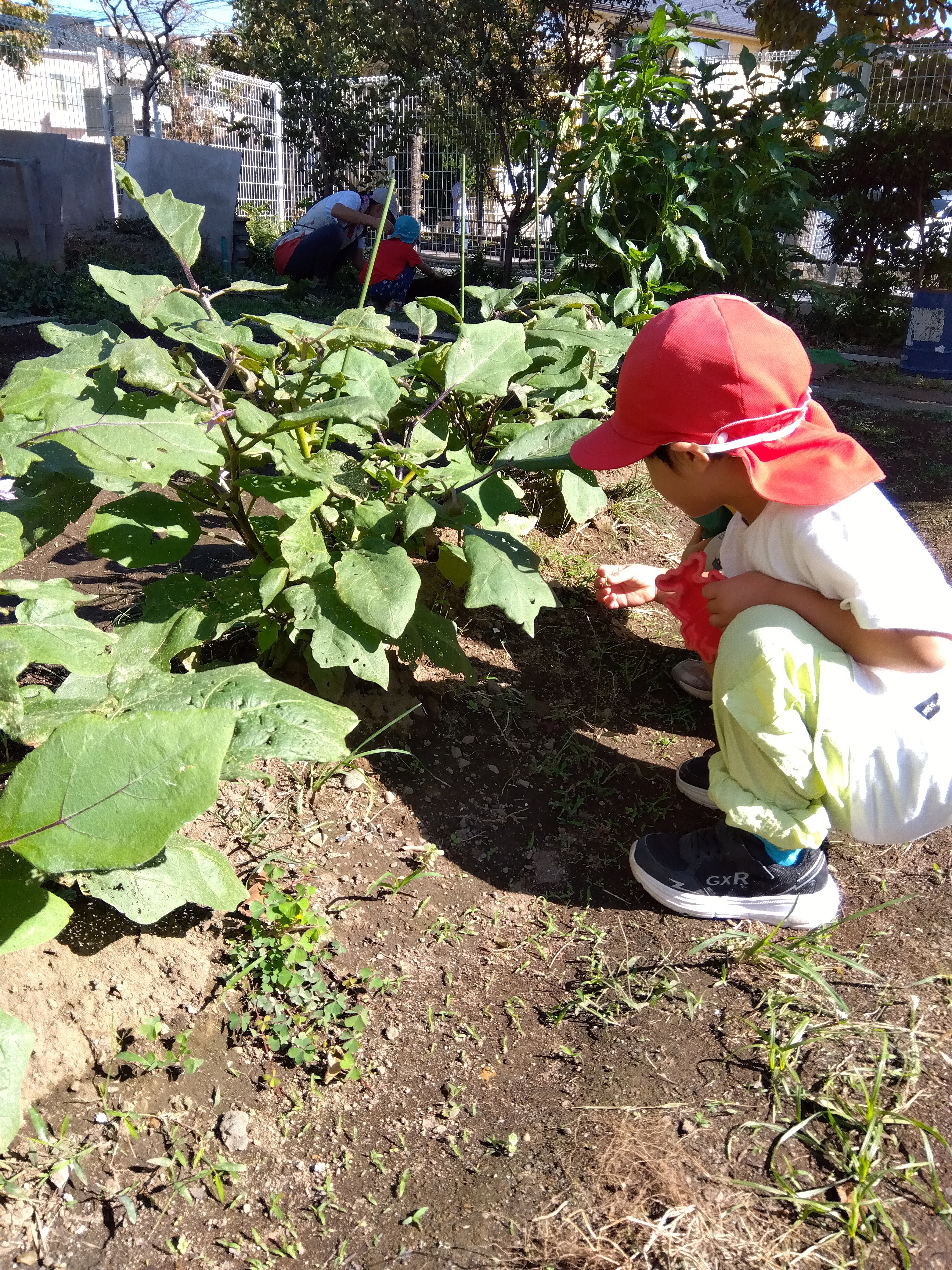 ➁暑い夏だったからでしょうか。あっという間に枝や葉ががたくさん出てきて、秋ナスをたくさん収穫することができました。秋ピーマンは、背丈が年長さんの高さまで成長しました。