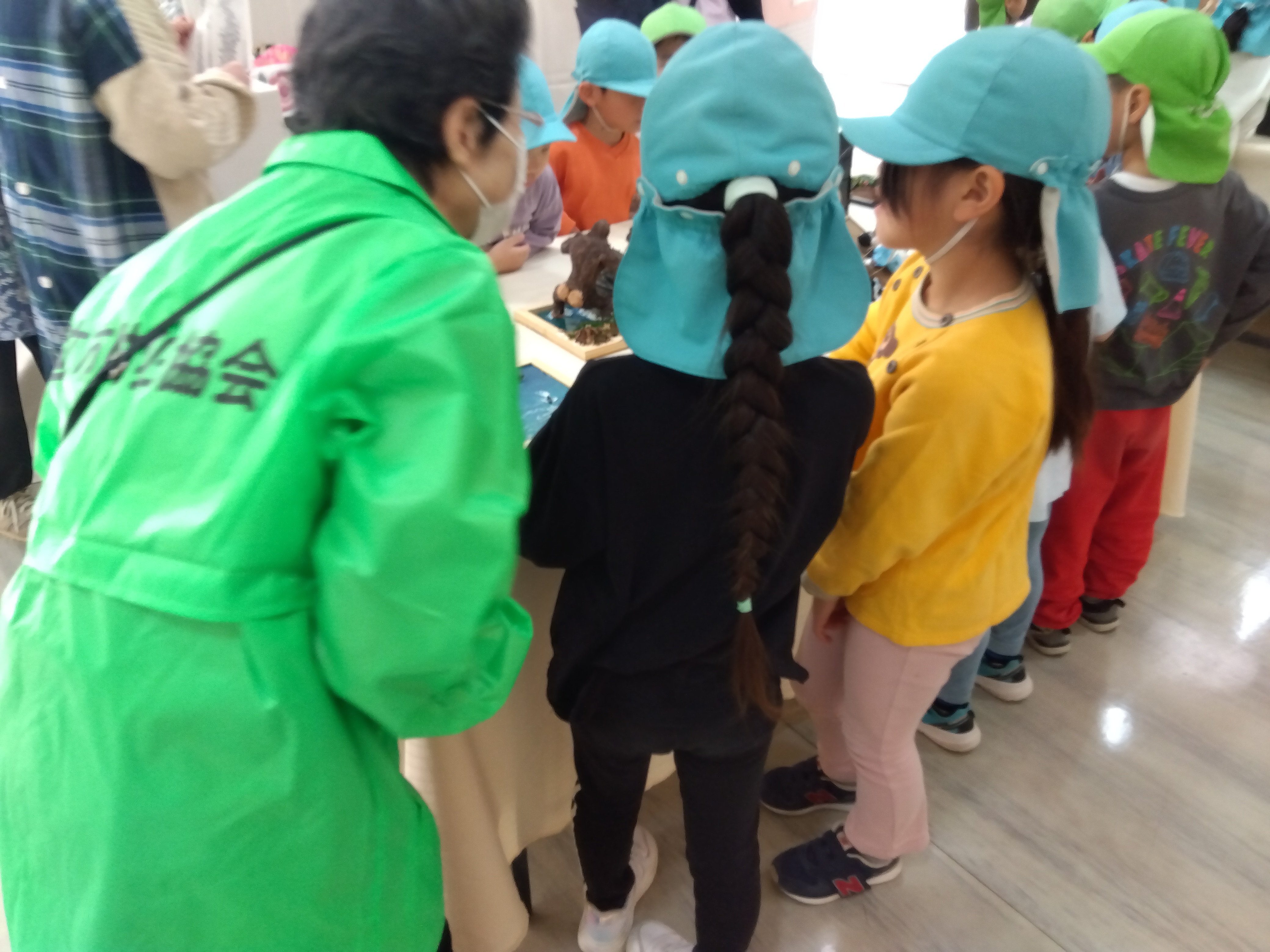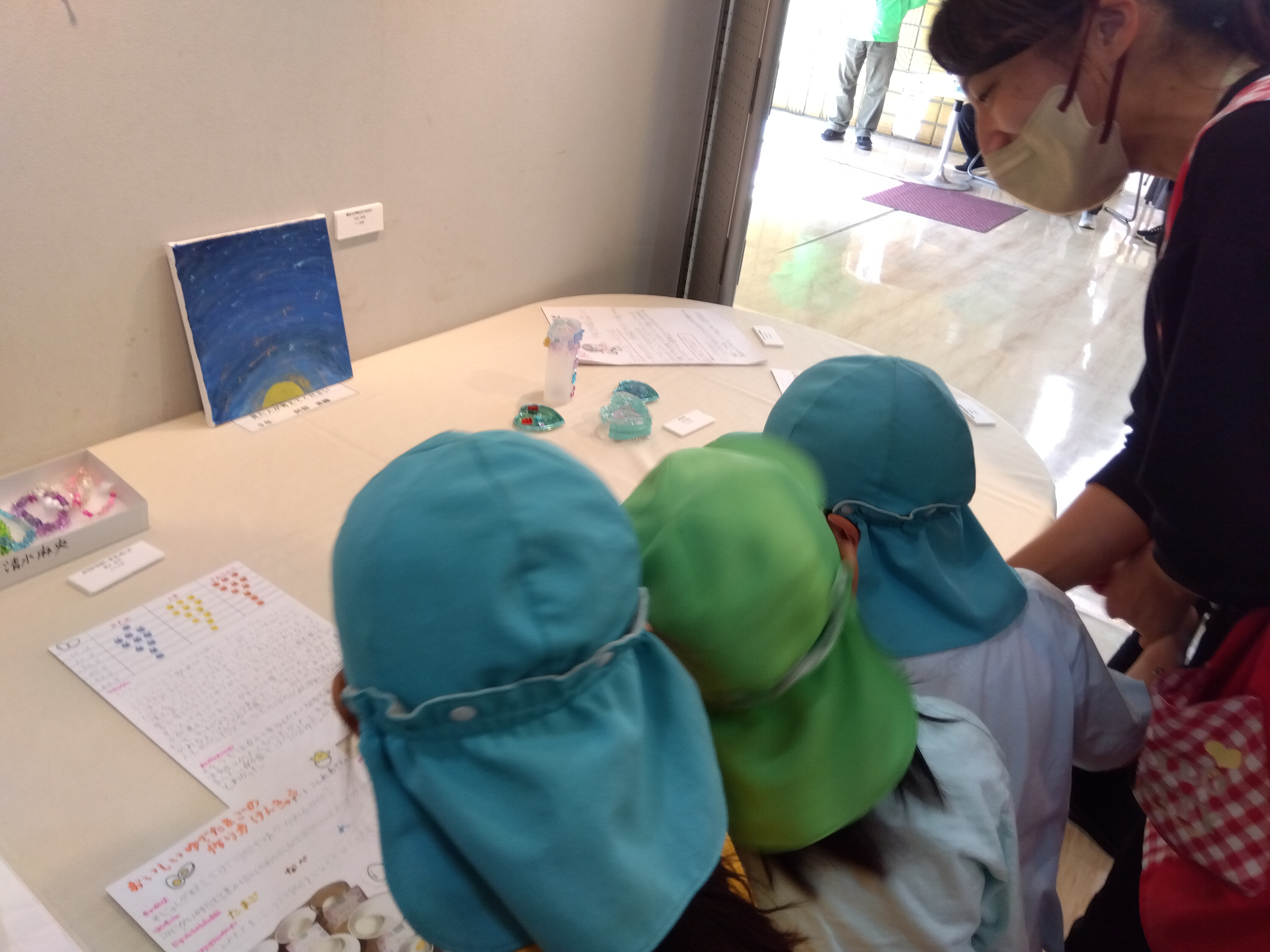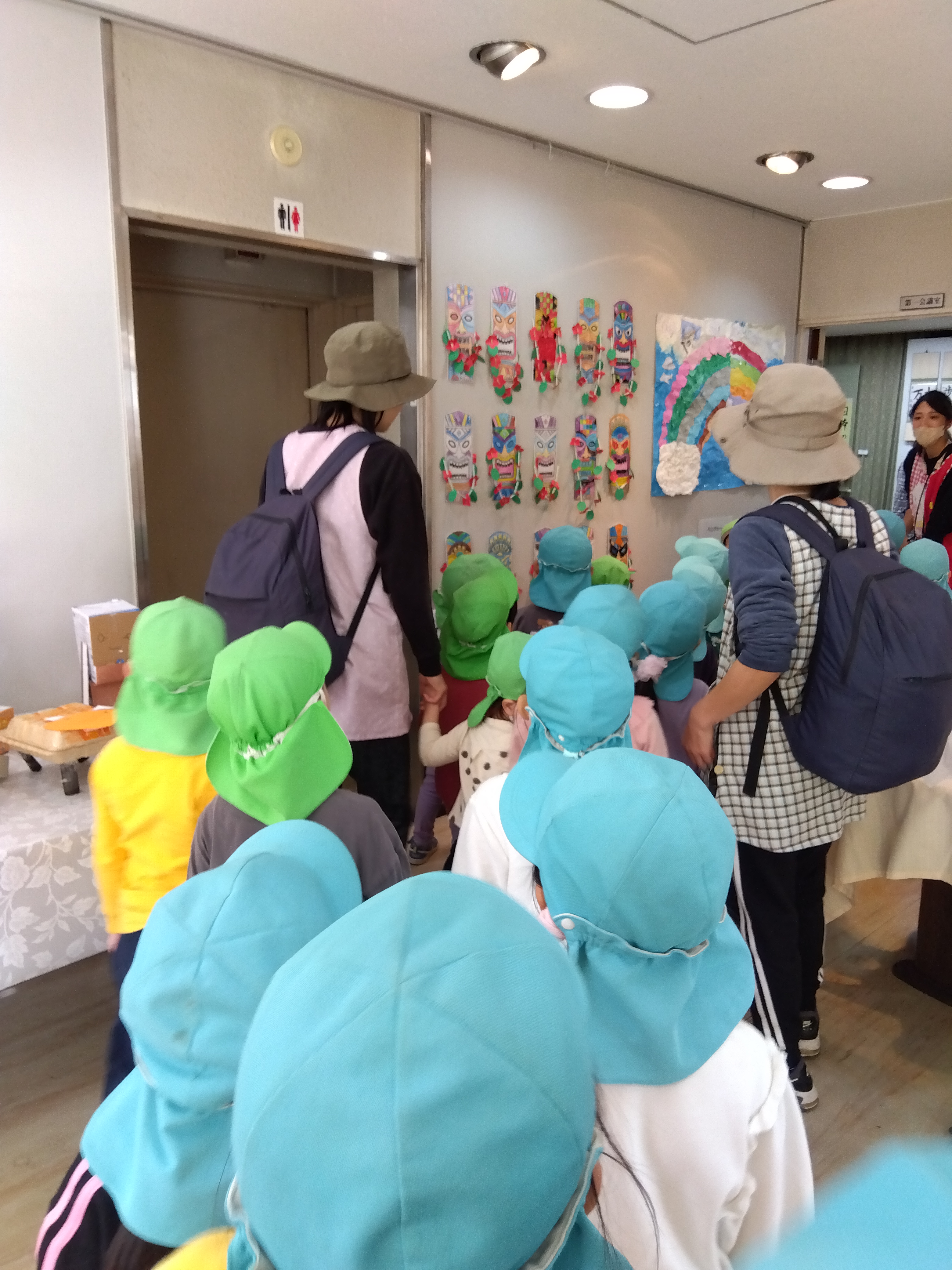 クレヨンで塗った「ティキ」と手作りの「レイ」が飾られていました。