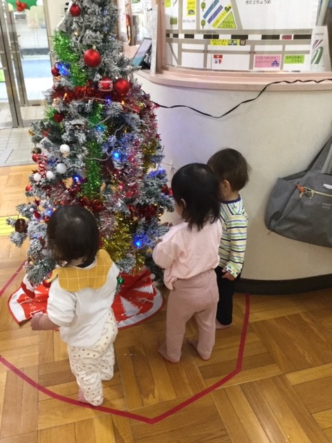 クリスマスの制作を窓に飾ったり、玄関にあるツリーをみたりしながらいつもと違う雰囲気を感じるひなぎく組さん。