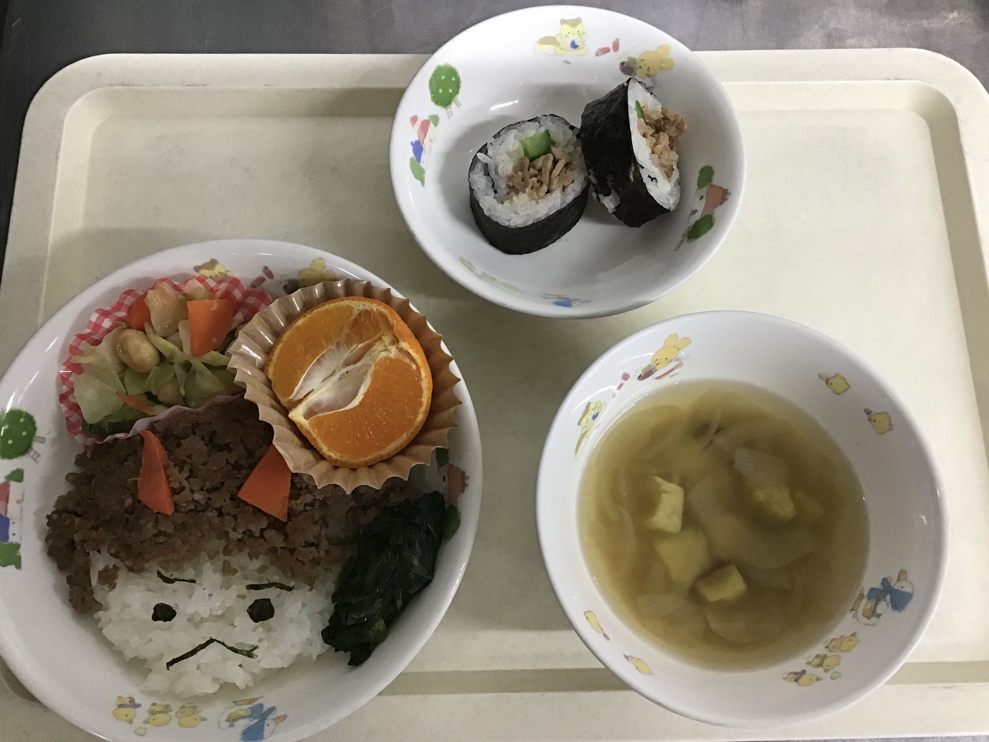 節分に、そぼろで鬼ごはんを作りました。 サラダには、大豆がたくさん入っています。 おやつの恵方巻も、子どもたちはたくさん食べてくれました。