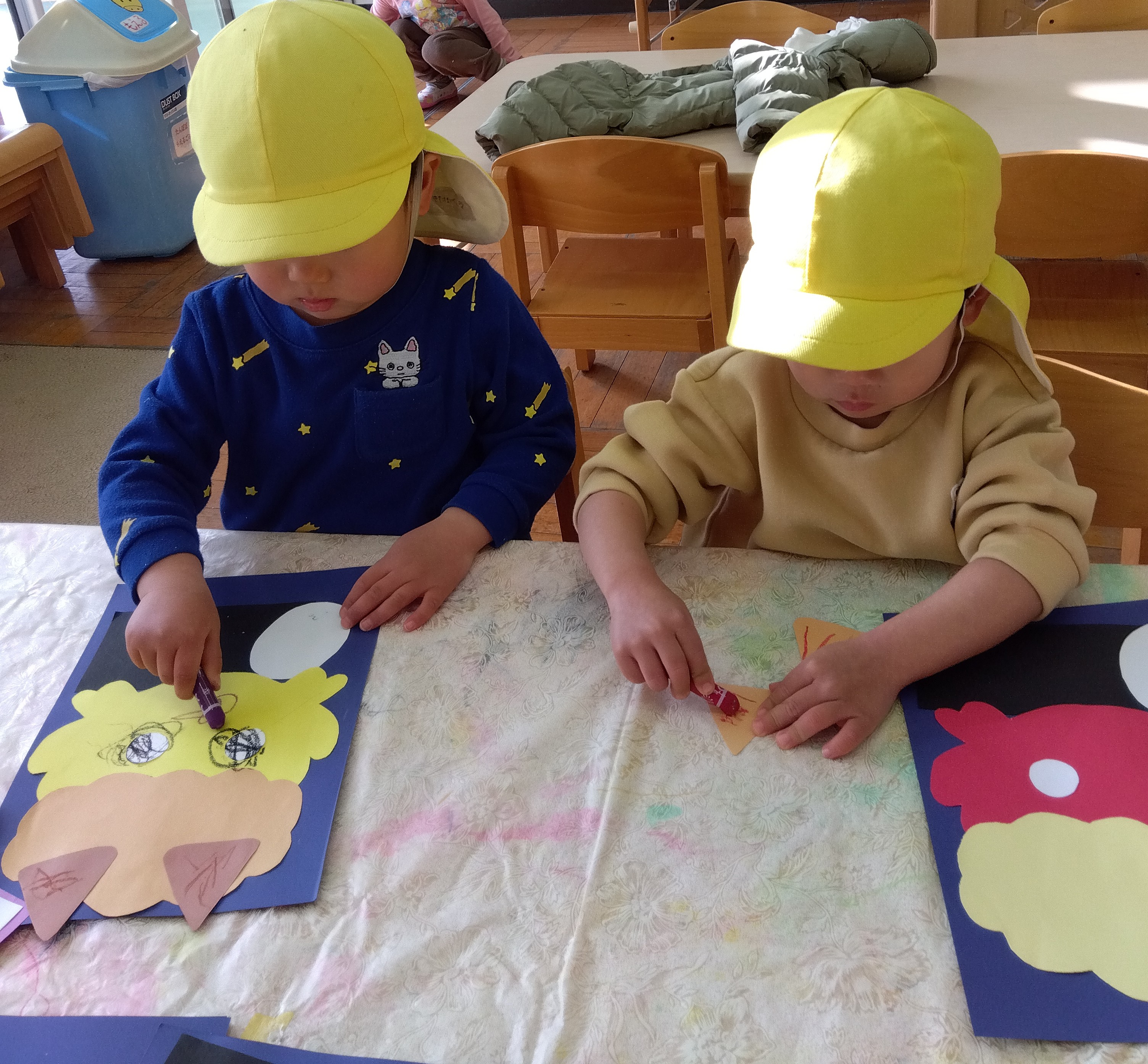 節分の制作テーマは「恵方巻を食べている鬼」。 目、鼻、口の位置づけを確認しながら描いたり、パーツを貼ったり、恵方巻の具材は毛糸を使って仕上げました。