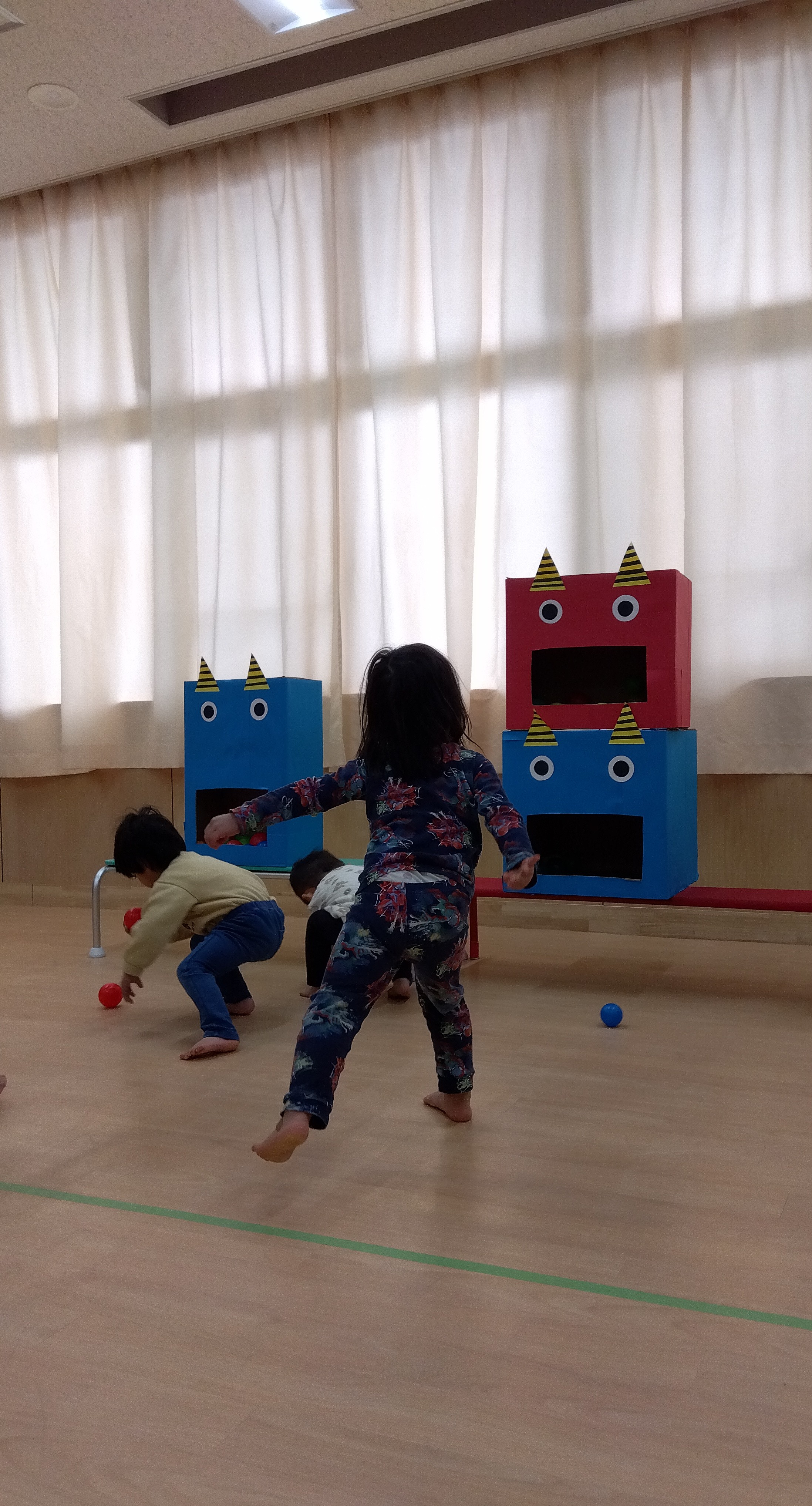 豆まきでは、大きな口を開けた鬼を発見。鬼の口内をめがけてボールを投げ入れるなど楽しんで鬼退治を行いました。