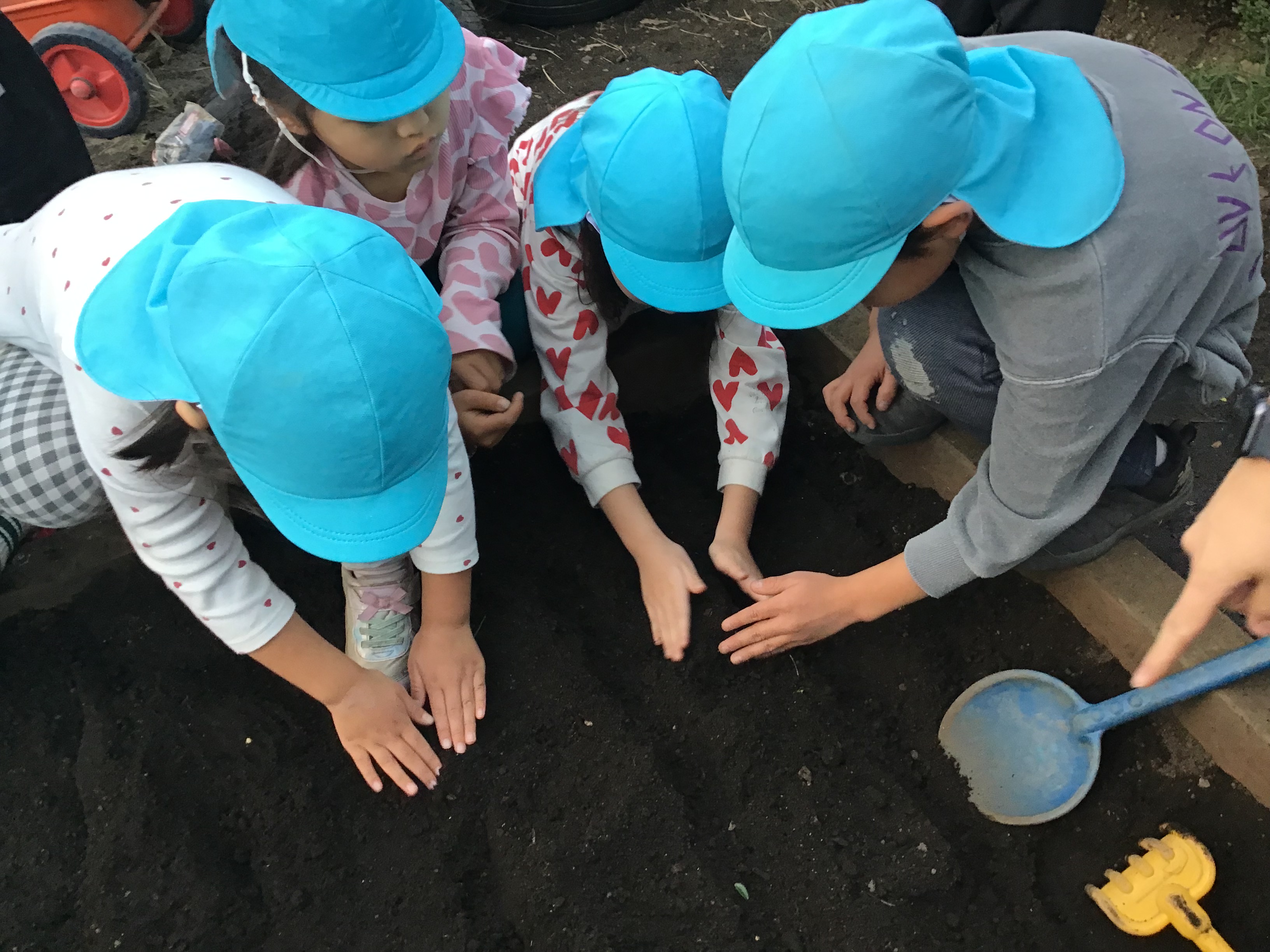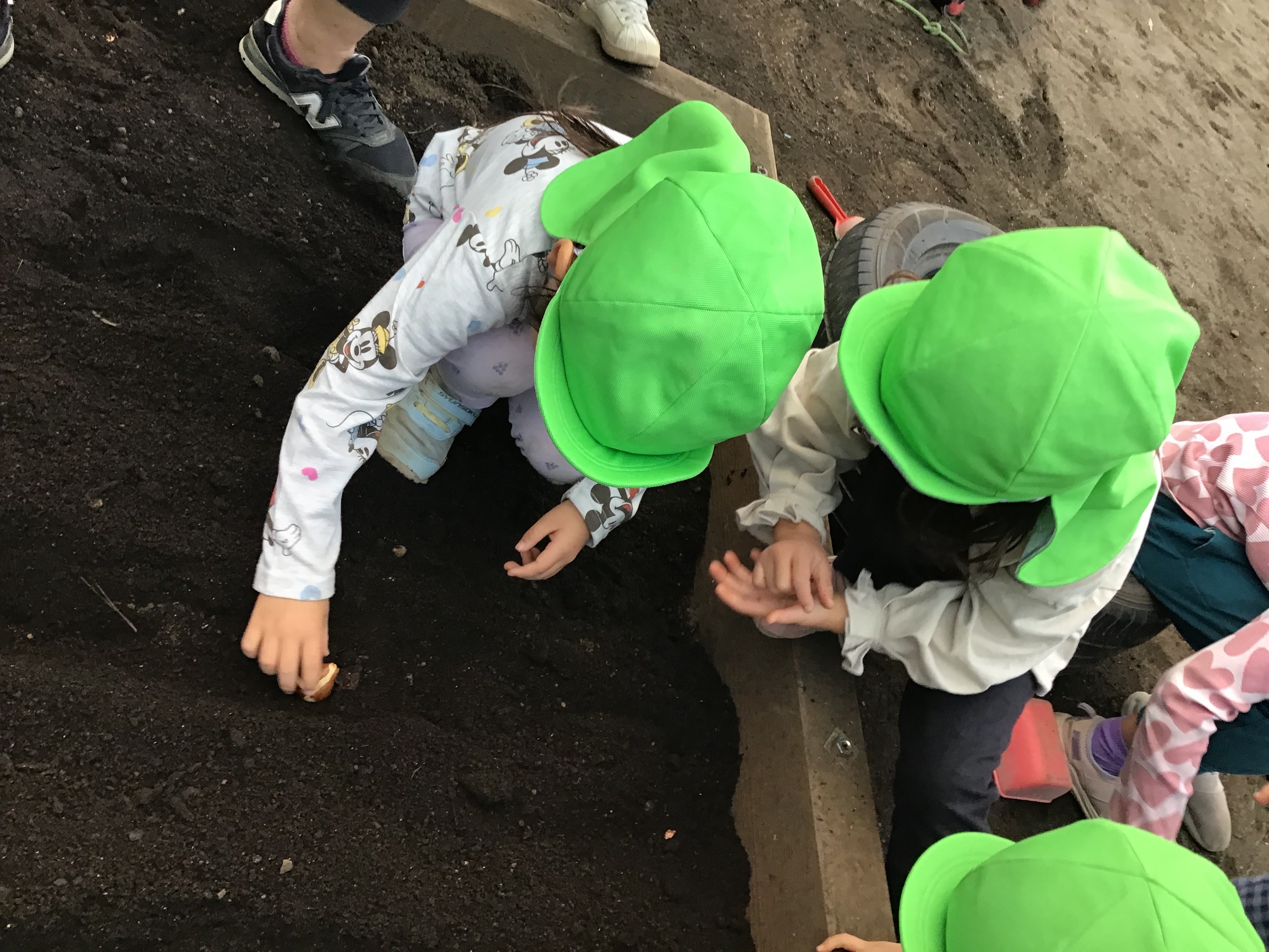 順番に菜園に球根を植え、「おおきくなーれ」「お布団かけてあげなくちゃ」等とつぶやきながら土を掛ける姿もあり、チューリップを楽しみにしてるようでした。