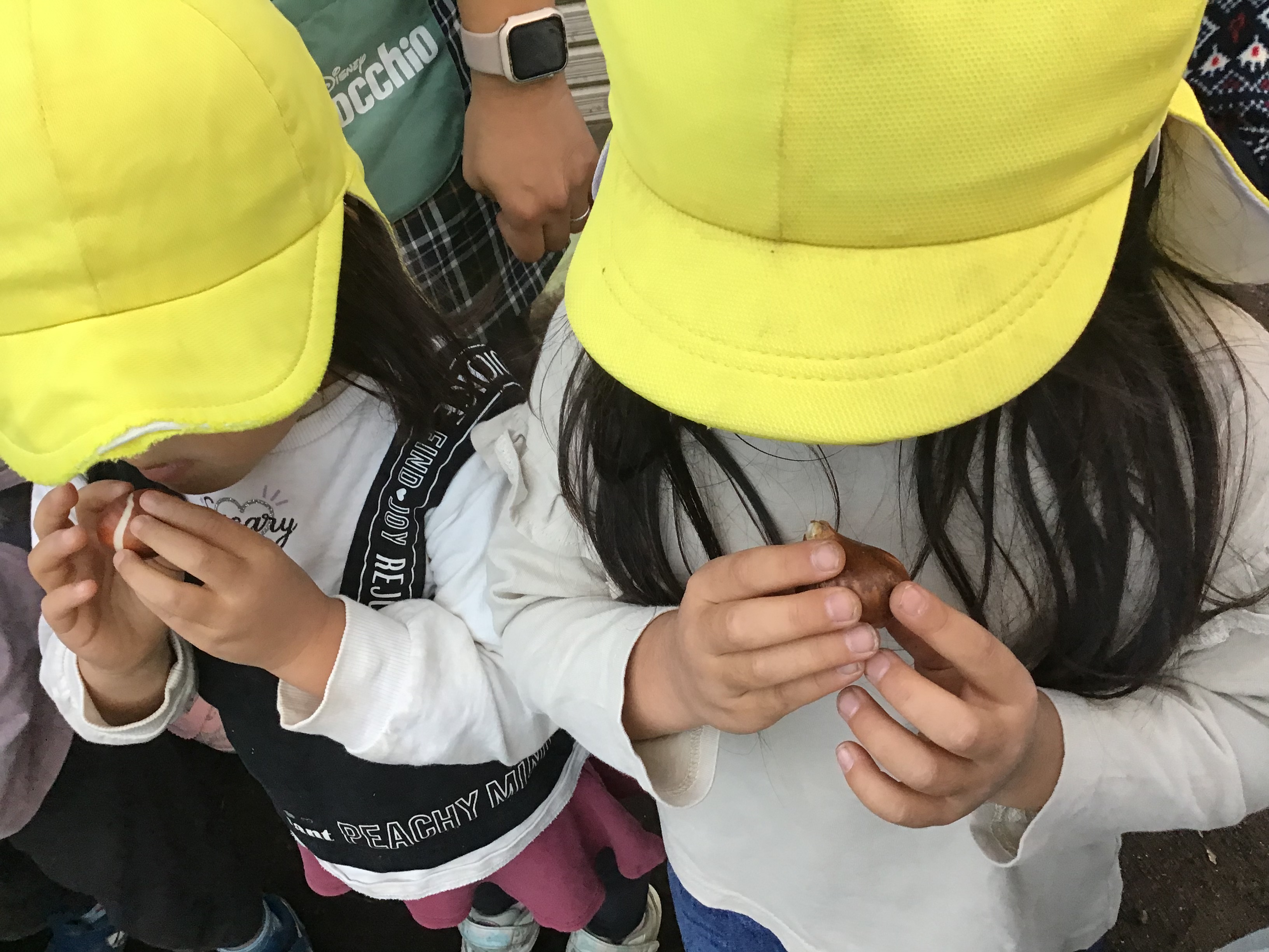 一人ひとりに球根を渡すと「玉ねぎみたい」「面白い形」等と興味を示したり、においを嗅いだりする子もいました。