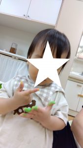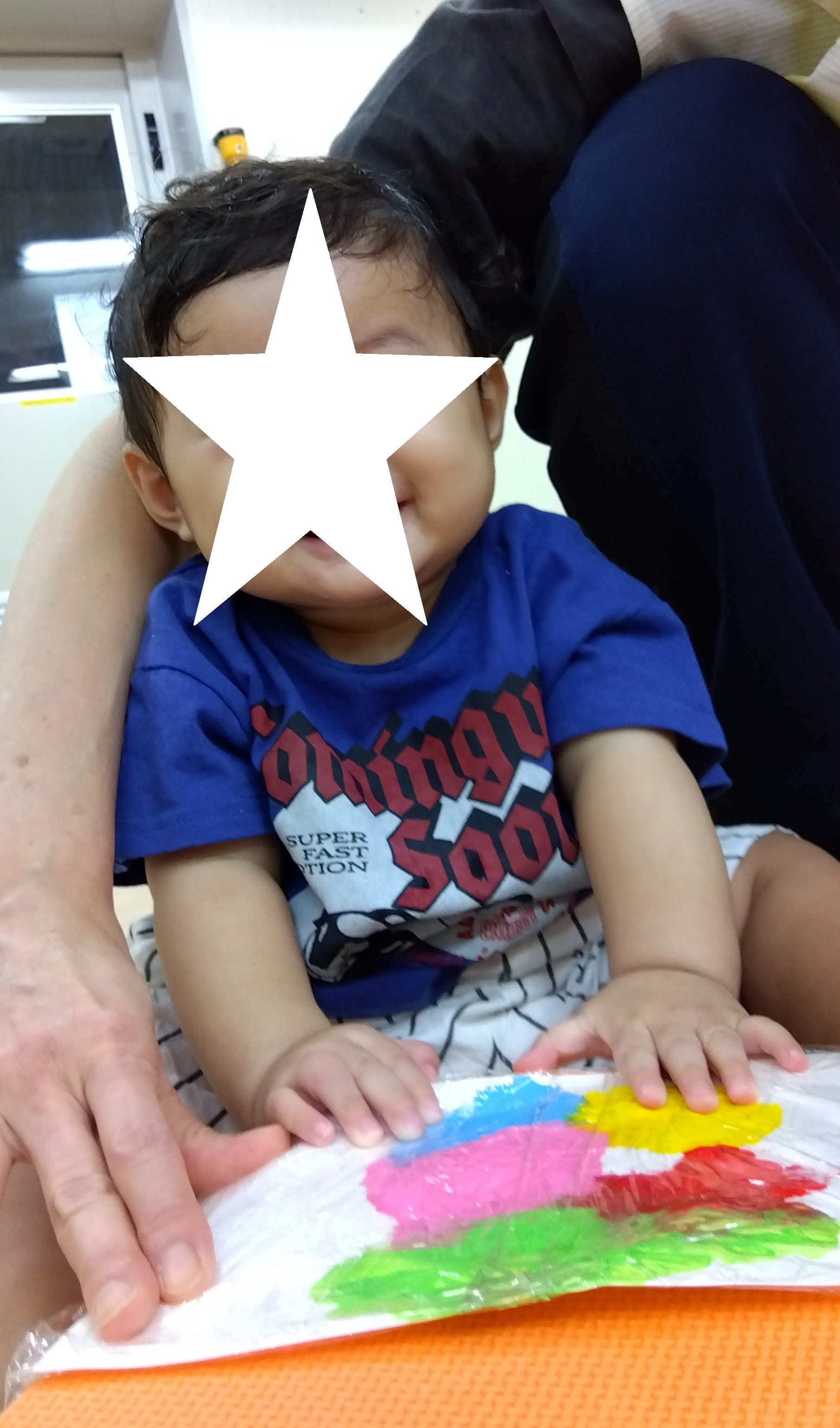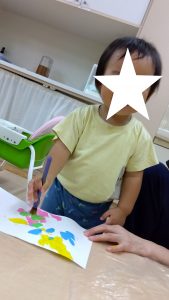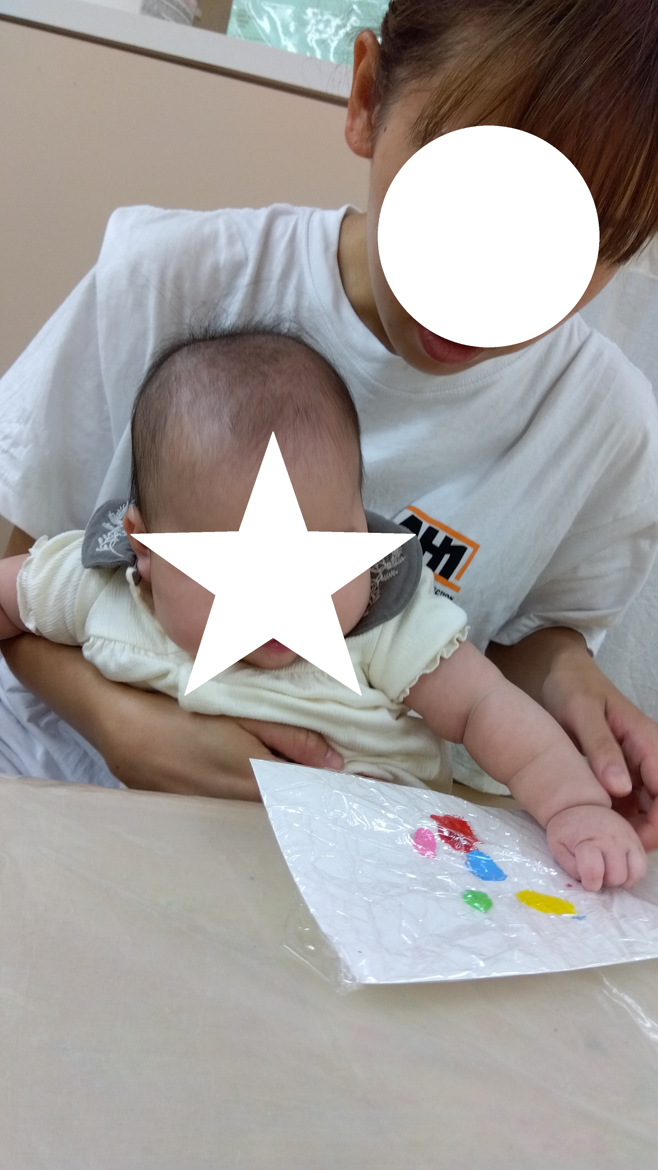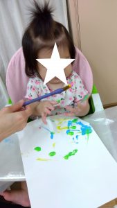 手を使っての制作も、絵の具が潰れる様子を不思議そうに見たり叩いたり、保育士と一緒に触れたりと感触を楽しんでいました♪