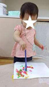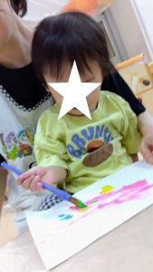 筆には初めて挑戦してみたのですが、見慣れない物に興味津々だったり、保育士の真似をしながら画用紙に色を付けたりと、とっても楽しんでいました☆