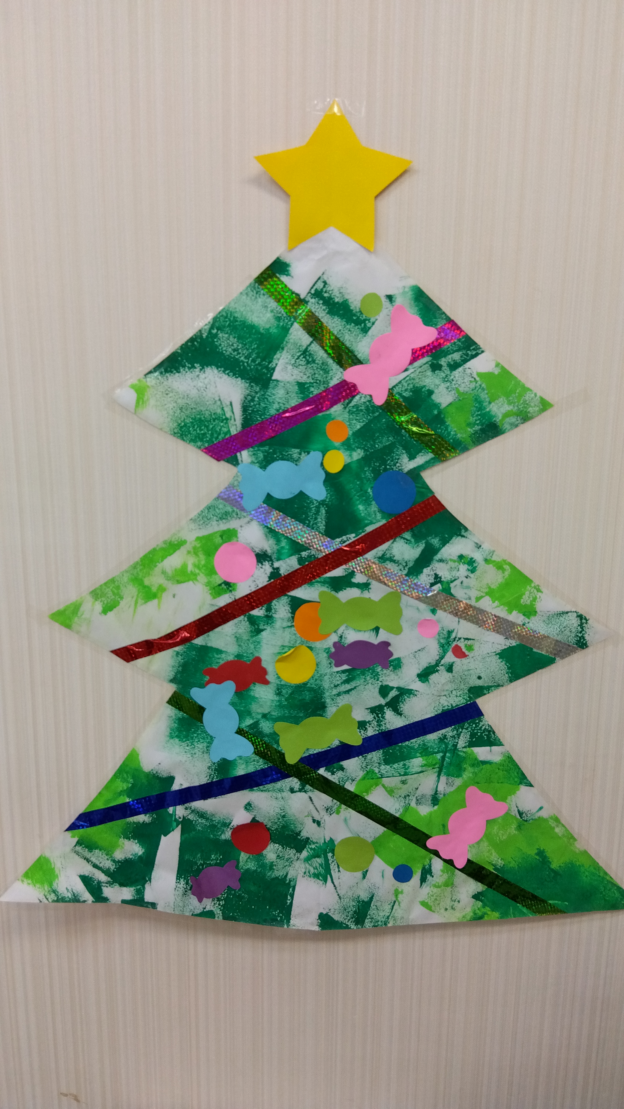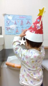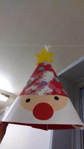 制作では、絵の具スタンプとシール貼りをしてサンタクロースの帽子を作りました。目の部分も器用に指先を使って貼ることができましたよ!